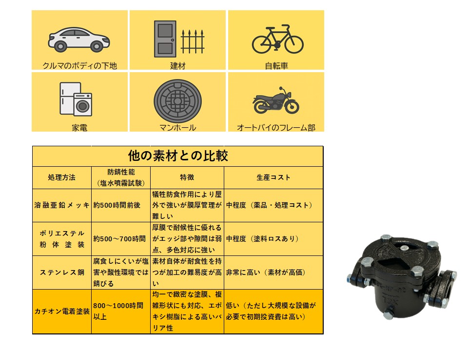 この技術は粉体塗装や亜鉛メッキと比較して優れた防錆性を発揮しながらステンレス素材よりもはるかに低コストである点が大きなメリットとなり、自動車部品や建材など耐久性とコストパフォーマンスの両立が求められる製品に広く採用されています。 - 本体/各部材寸法は従来品に準拠いたします。